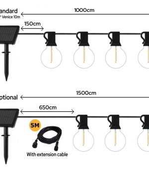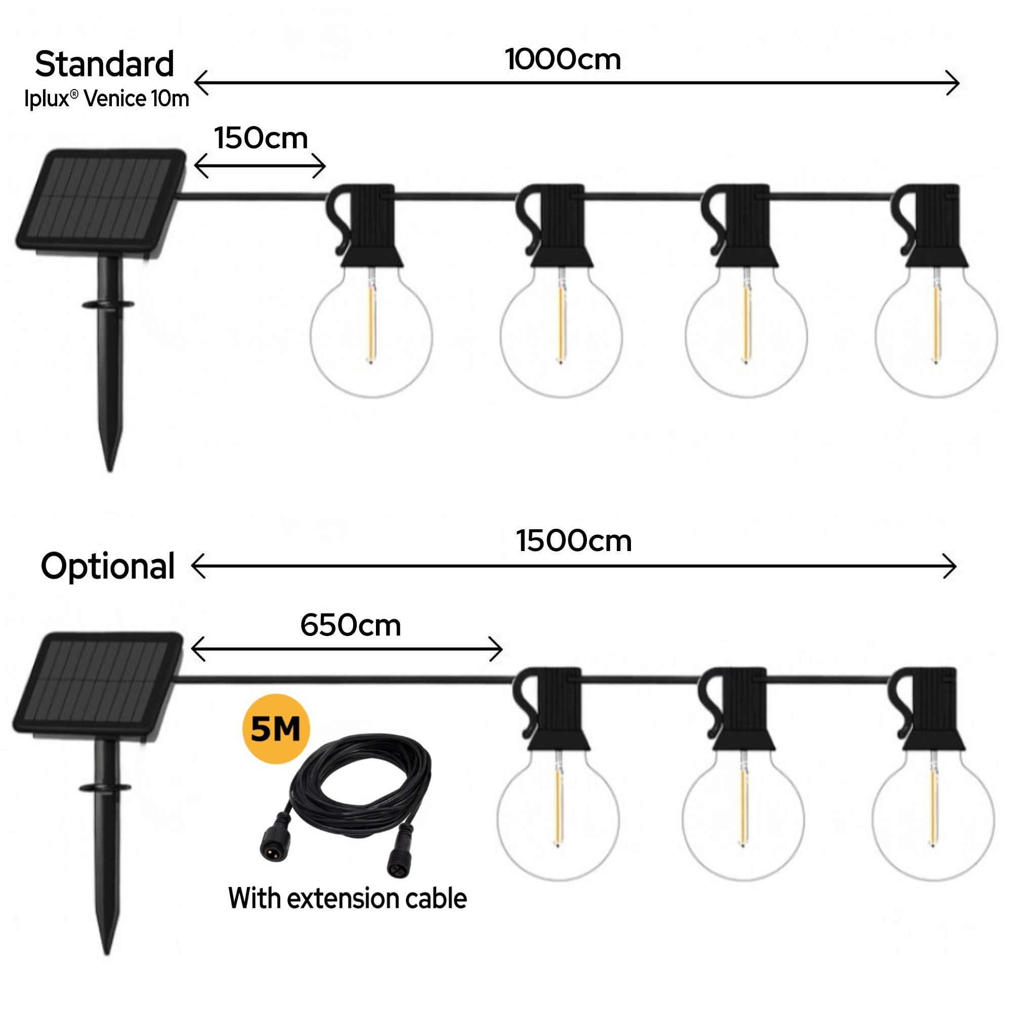 Zonder verlengkabel bedraagt deze afstand 1,5 meter. Met de Iplux® Venice 5m verlengkabel vergroot je dit tot maar liefst 6,5 meter, zodat je het zonnepaneel op de best mogelijke plek in de zon kunt plaatsen, terwijl het lichtsnoer hangt waar jij de meeste sfeer wilt creëren.